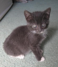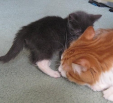 is just adorable. She is sweet as sugar and real friendly. She snuggles up with the foster mom at night and is great with the dogs and cats in her foster home. She is about 6 weeks old and still real small. I put a photo of her with our cat so you can see how small she is.