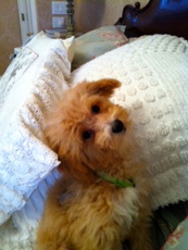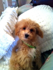 Carter is a 6 lb., 4-5 month old apricot and white miniature poodle pup.