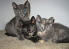 2 girls and 1 boy. They are sweet and friendly. They LOVE people and are very pampered in their foster home. One of the girls was a little camera shy, but she is really sweet. They are now about 7 weeks old.