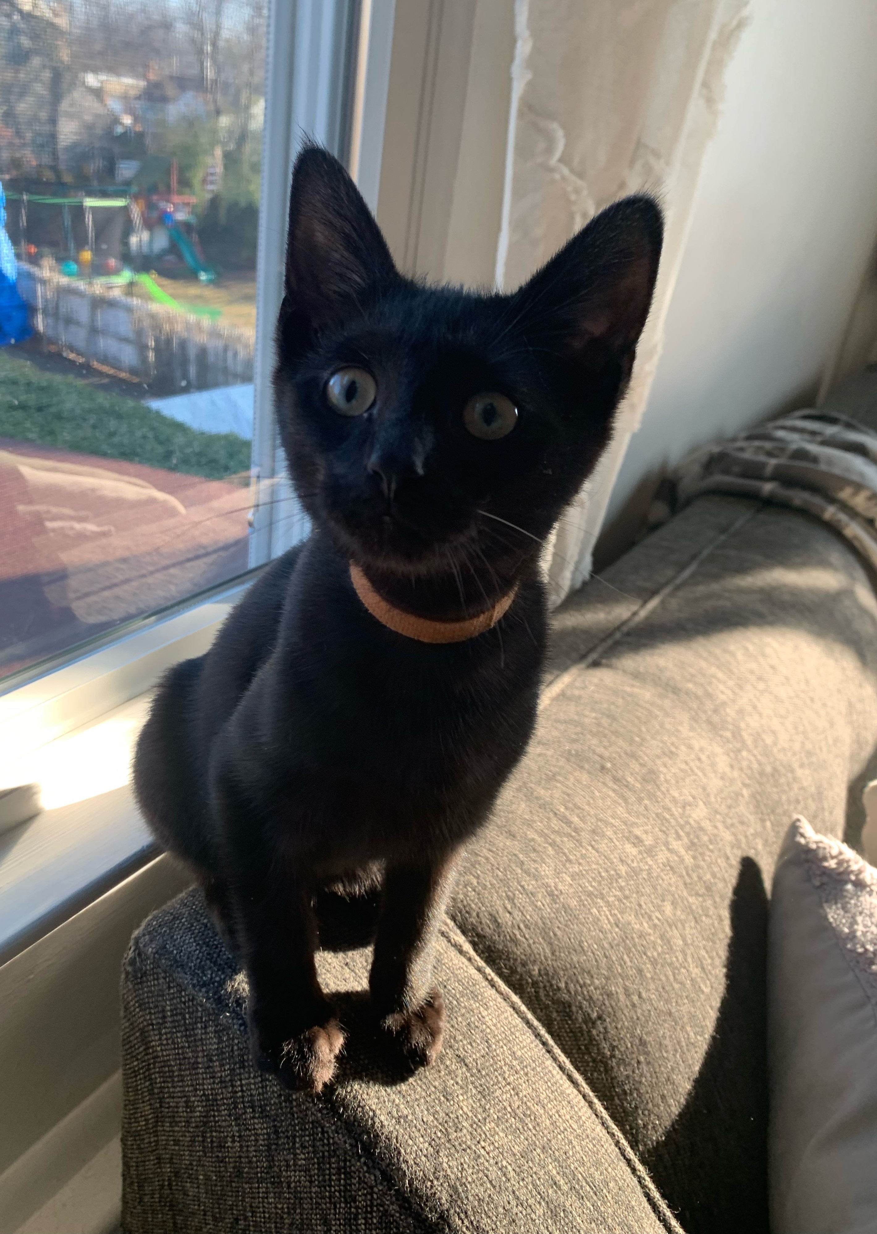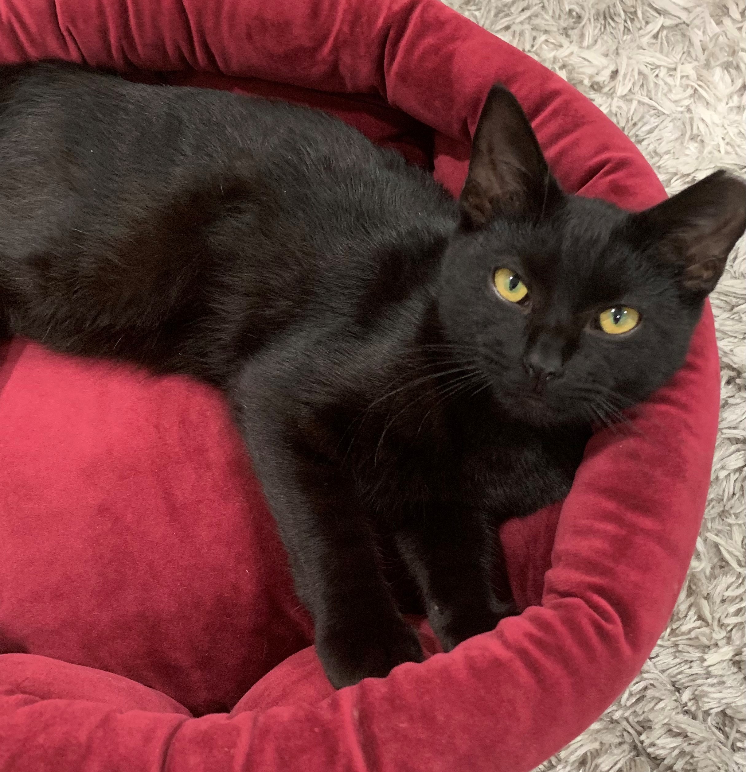 Born 8/1/2020 This handsome boy was rescued from a hoarding situation and was seeking attention from the moment we met him. Artemis has thrived in his new environment free from a cage. He greets us at the door for a quick hello and pops up on his back legs to reach his food bowl before it reaches the ground. Artemis doesn't have to worry about getting good nutrition consistently now. He has also discovered treats, toys and all the petting he wants. Artemis will often nudge a hand for pets and let you rub him from his head to the tip of his tail. This sweet cat is ready for a home of his own though he doesn't mind sharing his space with his roommate Petunia. No dogs please.