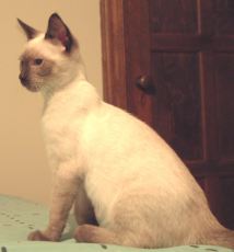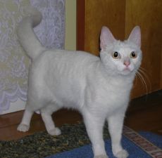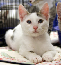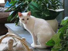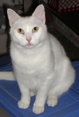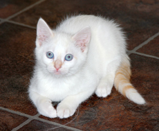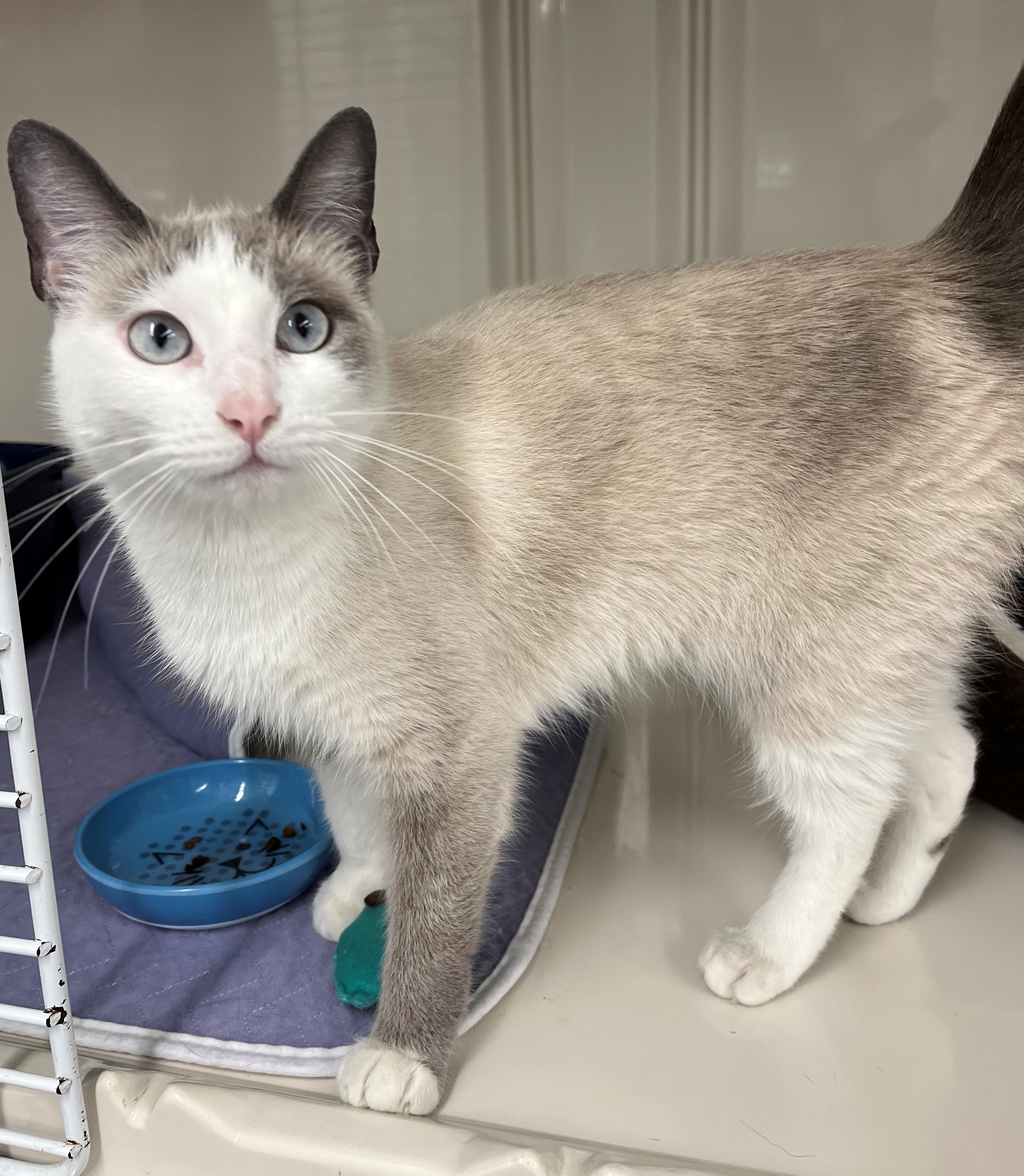 Allee is a pretty little girl, approx. 2 years old, white female flame point (on ears & tail) Siamese mix, that has the personality of a 6-month-old kitten. She is always looking for a ball, a new corner to explore, or finding something to entertain herself - like an opened bag on the floor. She interacts with abundant joy towards other cats. She delights in dogs. When not at play, she is a lap cat with a noisy purr. She has an excellent appetite. Life will not be boring with Allee in it.