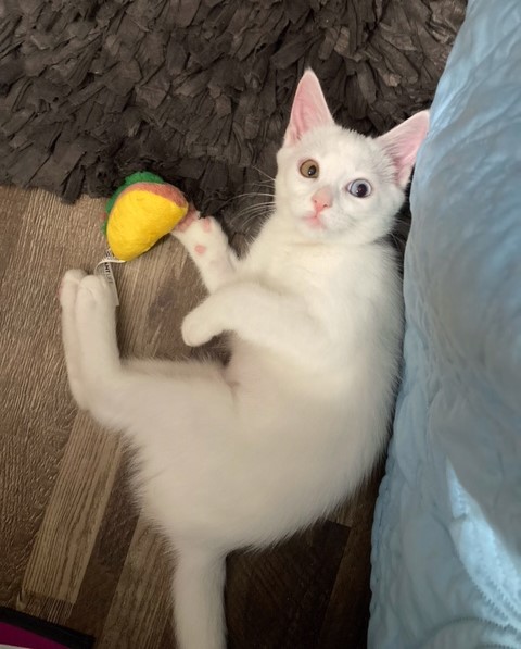 DOB - June 1, 2023 - Adoption Pending AKARI Meet Akari an absolute beauty and the first half of our pair of white kittens. Like her sibling Kumo, Akari is playful, energetic and very sweet. Akari is a curious little girl but equally loves to cuddle when she’s not busy exploring. These twins would love to stay together but if not we prefer each is adopted by a family with older children, and a friendly, adult cat(s) to cuddle with at times . Please note, Akari is very vocal when it’s chow time, but as she is deaf, it is normal for her to be a little loud when meowing. KUMO As beautiful as her sibling Akari please meet Kumo. Like Akari she is playful, energetic and very sweet. She can be a little shy at first but will sit next to you as she gets to know you. Akari and Kumo would love to stay together but if not we prefer each is adopted by a family with older children, and a friendly, adult cat(s) to cuddle with at times