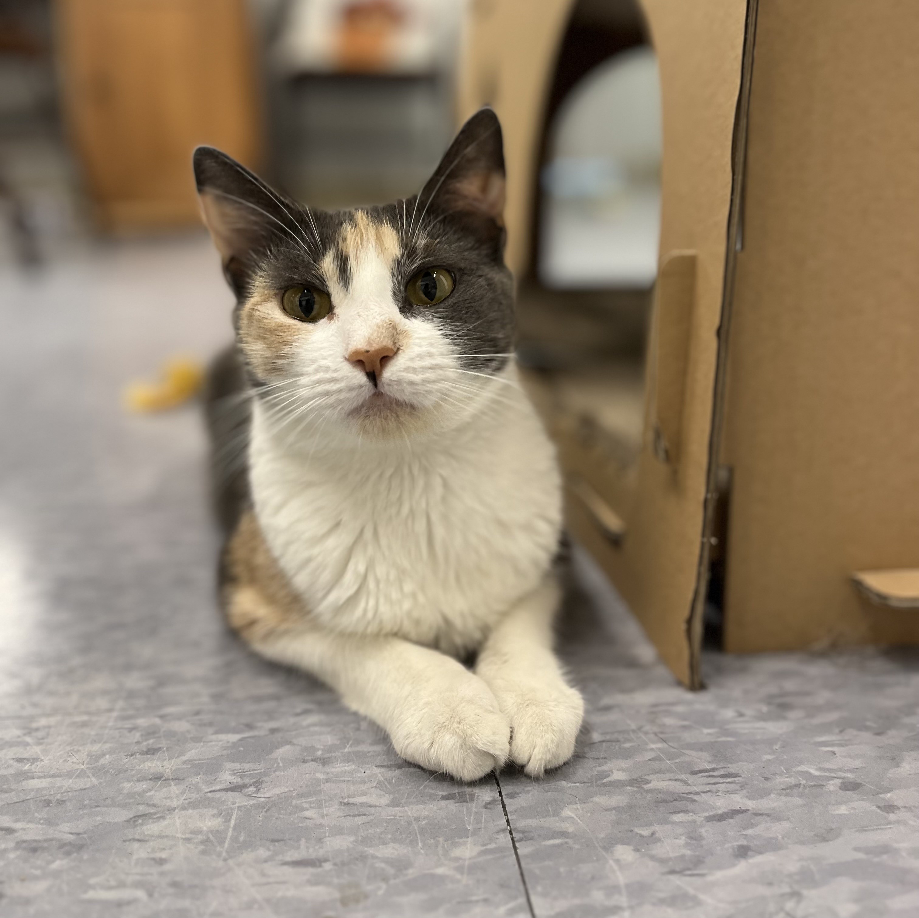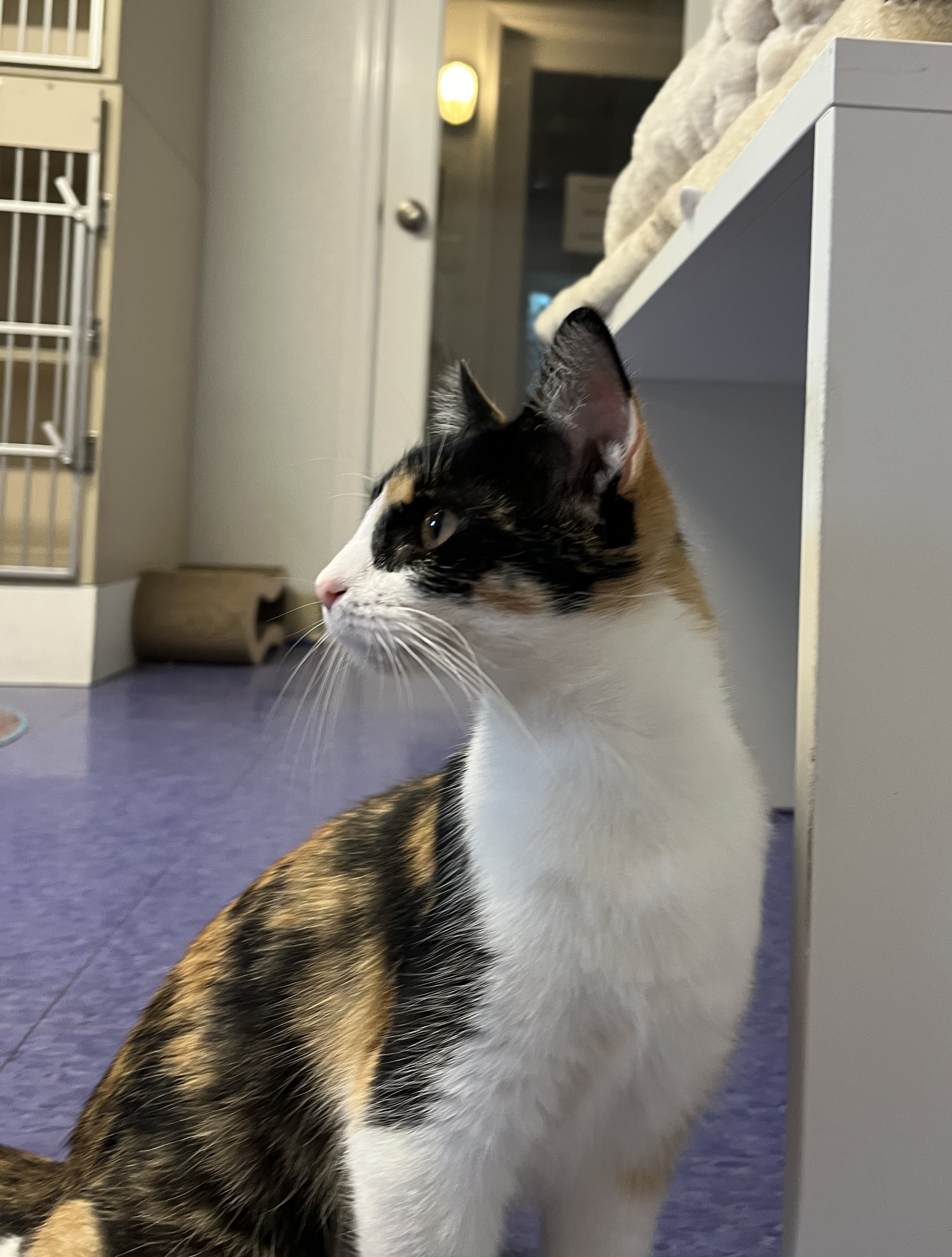 January 2025 Autumn is a petite Calico girl with gorgeous colors and an equally lovely temperament. She is friendly and affectionate. Autumn seeks out attention but is never demanding. She does enjoy resting alongside anyone that has time to sit for a while. Autumn is also playful and comfortable with other feline friends. Autumn loves window views and all the activity she can see from her perch on top of a cat tree. She would be a sweet addition to any family.