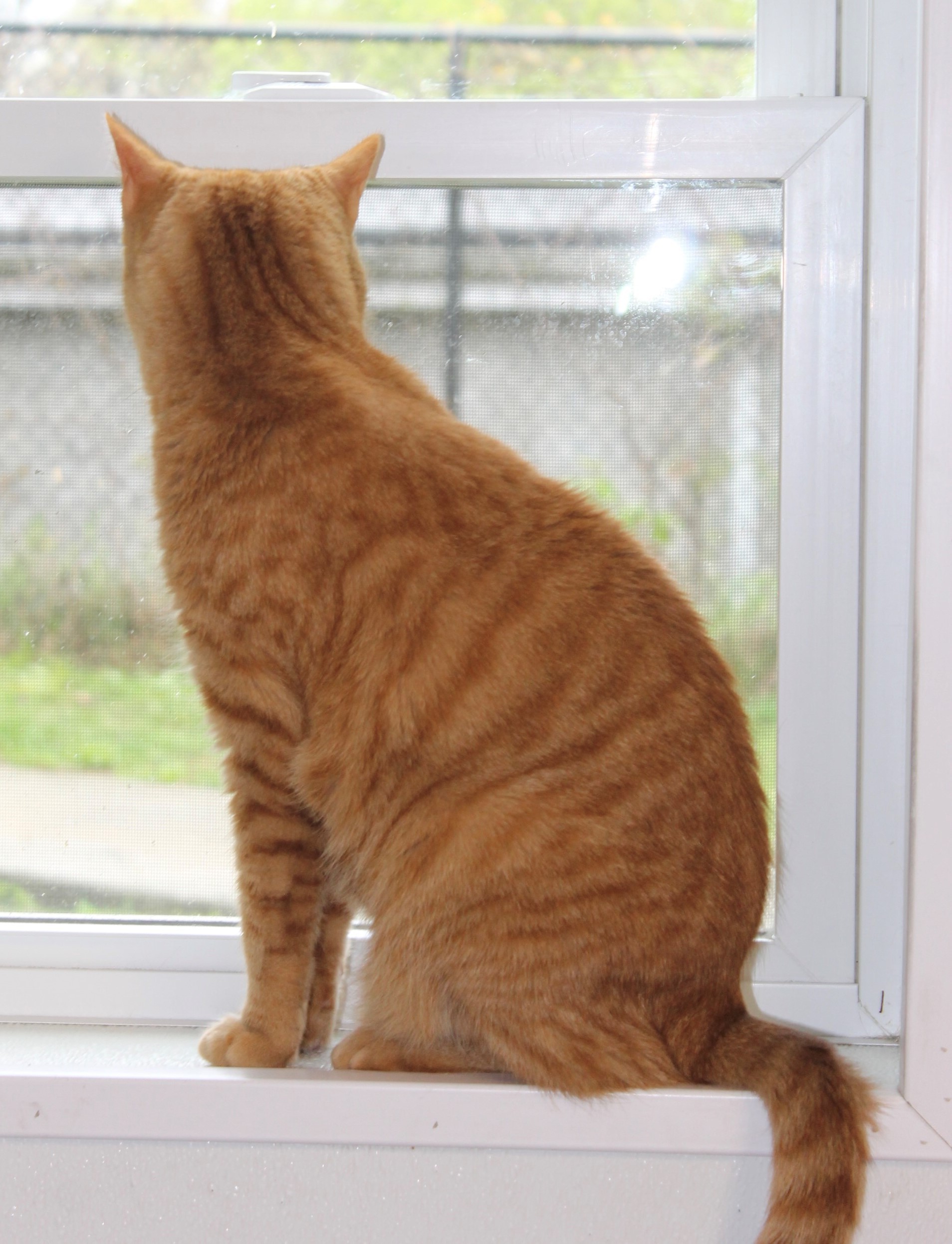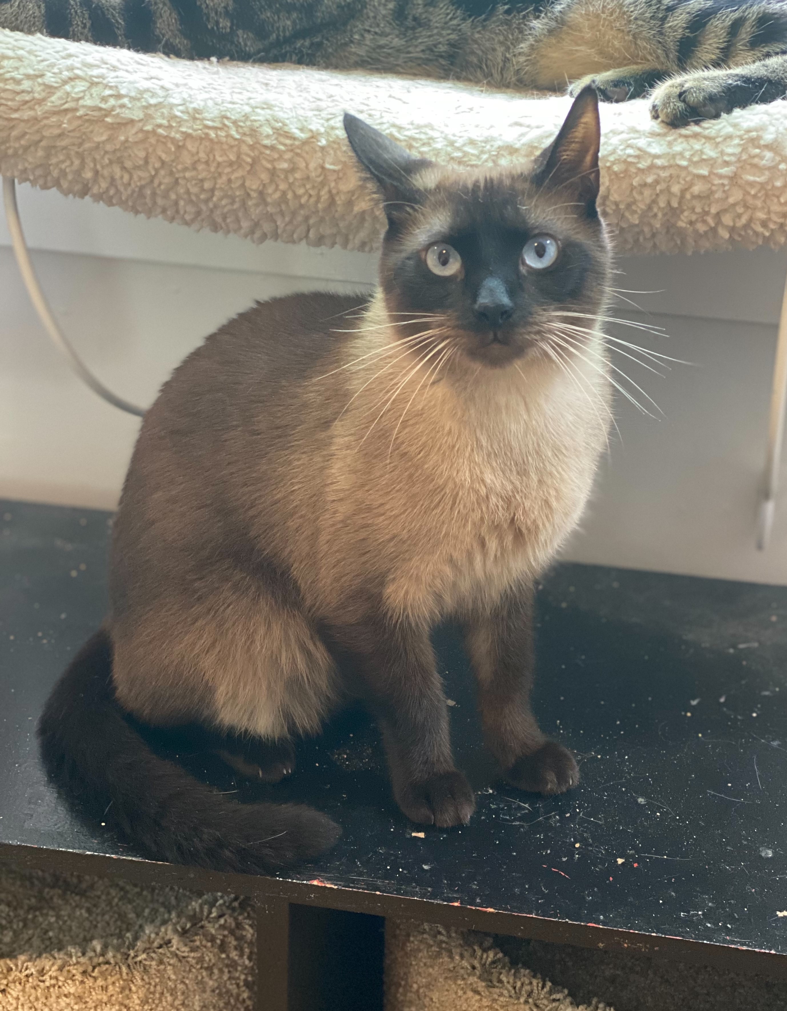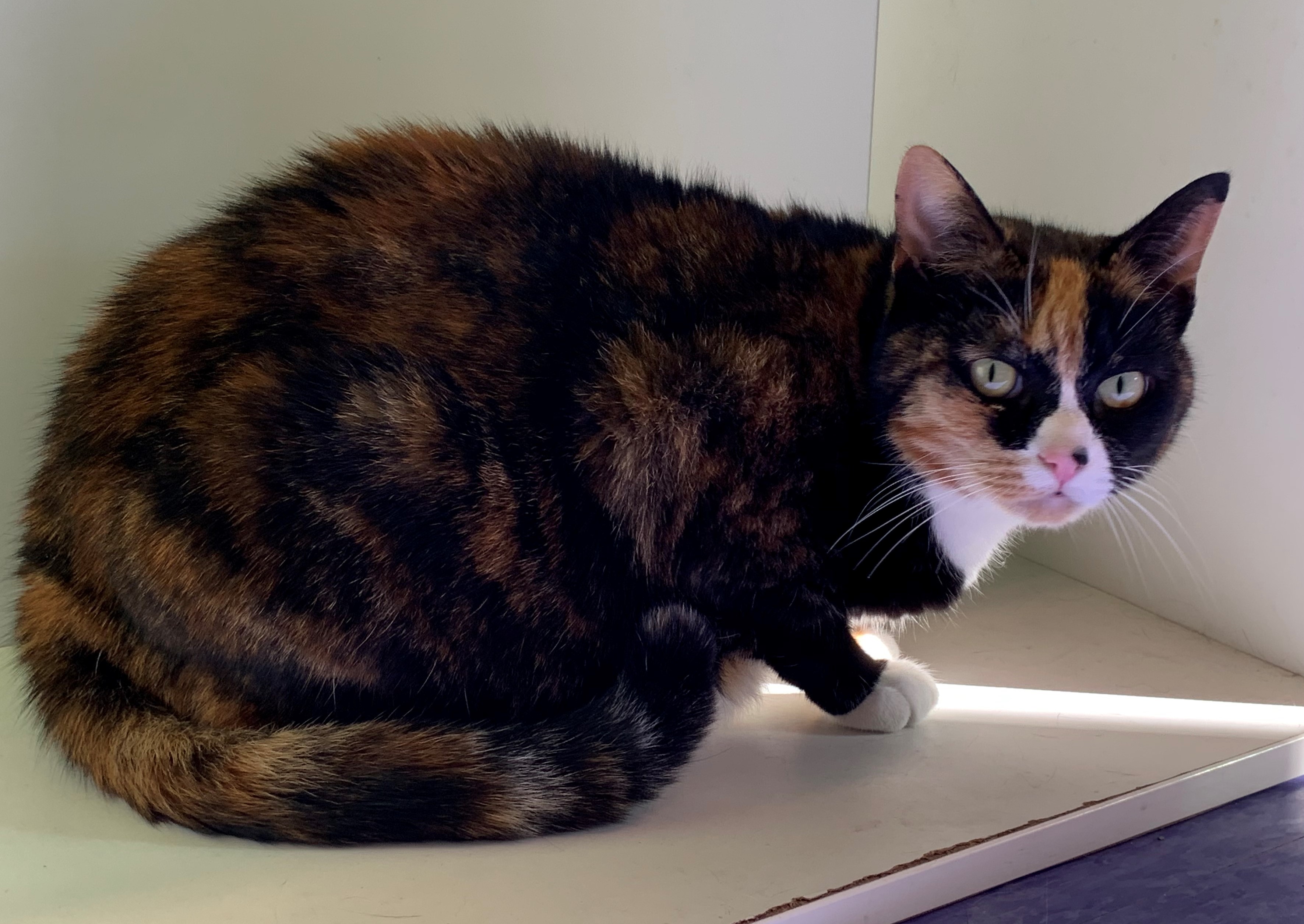 Ava, about one-and-a-half years old, was found behind a grocery store trying to fend for herself after being abandoned (she is gentle and loves people so we know she was not a street cat. She has adjusted very quickly to her perch