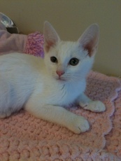 Here comes sweet little Aspen! One of Gwen's litter of kittens and brother to Alpine, Ace, Autumn and Aubrey. He is very affectionate, sweet and playful. This snow white boy is a real delight and would make a wonderful addition to any home. If interested, please email madie96@aol.com.