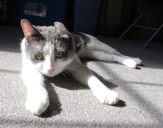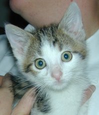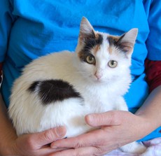 This is an adorable six month old female kitten named Alex. Someone found her last week hiding under a car hearing her meow. She came right out for some petting and mmediately began purring. Alex is very happy not to be on the street anymore and would love to find a loving home of her own. She has been tested for feline leukemia and feline HIV which were both negative. She is an active and friendly kitten. She would do best with a family who can give her lots of attention and play with her. She would prefer to be an only pet.