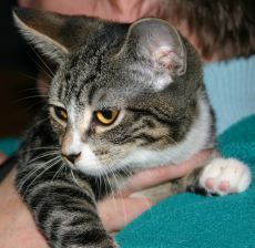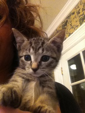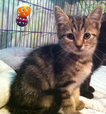 Acorn is an adorable baby kitten, born in late August 2012, and rescued from the streets. This sweet little guy now resides in a foster home with other cats and several small dogs, all of whom he gets along with. Acorn is very curious and playful but he also LOVES to just sit on your lap and he purrs when you hold him. Acorn has beautiful grey and brown markings, is up to date with his kitten shots and is in excellent health. To meet Acorn, you may contact Gwen at gwenbuch@gmail.com or Pet Rescue.