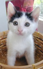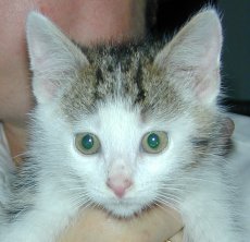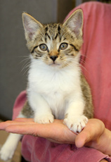 Ajax is a very cool dude. He's about 11 weeks old at the end of June, born early April and already neutered with his first shots done. Ajax delights in tossing his toys around and then chasing them, he purrs as soon as he sees you walk in and adores back scratches. He's an active tabby and white boy who would love another furry playmate in his life. Ajax is brother to Amanda and Calliope, listed separately. Ajax is patiently waiting for a lifetime friend to play catch with.
