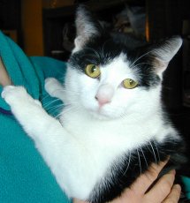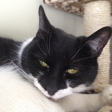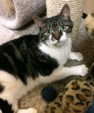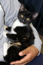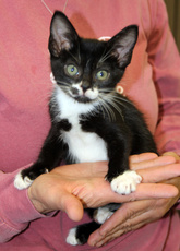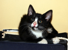 Alex is the perfect little gentleman in his tuxedo. He loves to be cuddled and will greet you at the door, hoping to be picked up and snuggled. Sometimes, he'll tap your ankle to let you know he wants affection.. Who can resist? Alex can be laid back, quietly observing everything. But when he's in a playful mood, he runs like lightening to bat a ball or tackle his sister (Annie, also available for adoption). With his sweet, easy demeanor, he quickly will blend into a forever home. Alex was born around late November, 2012 and now resides in a foster home with other cats and dogs.