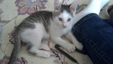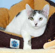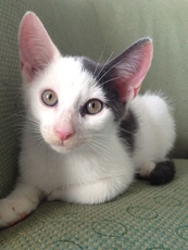 Atlas is a darling white kitten with large tabby patches. Though small in stature, but by all means large in spirit, Atlas charges the door when you walk in and squeaks for a hug until you pick him up. Somehow he knows it's his job to watch over everything, you can imagine him being the last to leave the house before a vacation so he can do the final checking. Atlas much prefers snuggling and purring to playing with toys but he never turns down a game of ribbon.
