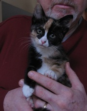 Audrey is stunning! Her coat is lovely and unusual (like an Australian Shepherd's coat). She has beautiful green eyes outlined in black. Audrey is about 3 months old. She is a real lap cat. She is not half as much interested in playing and exploring as she is in being held and cuddled. She loves other animals, including dogs and is great with children. She is a gem of a kitten, anything goes with her. She has no fear and is as curious as a dog.