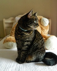 Alice is the smallest of the 3 sisters (Celeste & Ruby, also posted). She has tabby coloring with white feet and a white chin. Alice is a little more shy but highly intelligent and good at problem solving. She's fast enough to pounce on my 14 pound cat's tail and take off flying before he can turn around and swat her which is no easy feat. She's adorable, playful and enjoys activities around her.