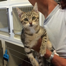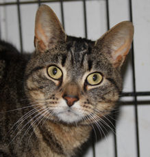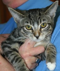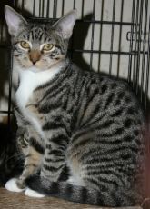 is an adorable 1 1/2 year old tabby, found on City Island by a kind family. She had a litter of kittens who were placed and now needs a home of her own. She has a calm, loving personality and likes other cats.