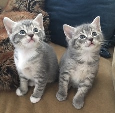 Born April 19th, these two sweet siblings are ready for their forever home! Born to a feral mom, Athena and Apollo have been raised in a loving foster home, and are completely socialized and friendly. Both are short hair tabbies with beautiful charcoal and heather gray tones. Athena is solid gray. Apollo has white paws. As the only surviving litter mates, these siblings are bonded and need to be adopted together.