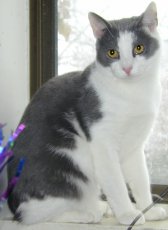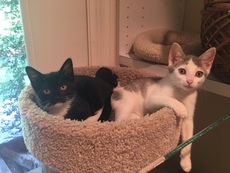 Alexi is a snowy white and heather gray short-haired female and Buddy is a short-haired tuxedo male. They love hanging out in their kitty climber and are always up for some affection. Alexi especially likes forehead scratches (bliss!), while Buddy loves a back stroke.