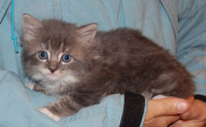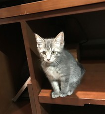 Alex's Kittens are now about 12 weeks old (as of 7/16/17) and are simply adorable little bundles of grey fur, one male and two females. Onyx (male) and Ruby are short hairs while Opal is a fluffy long hair. Ruby is the runt of the litter with a distinctive 3 toes. All are sweet, cuddly kitties. We prefer they be adopted as a pair, unless there is a young cat already in the household.