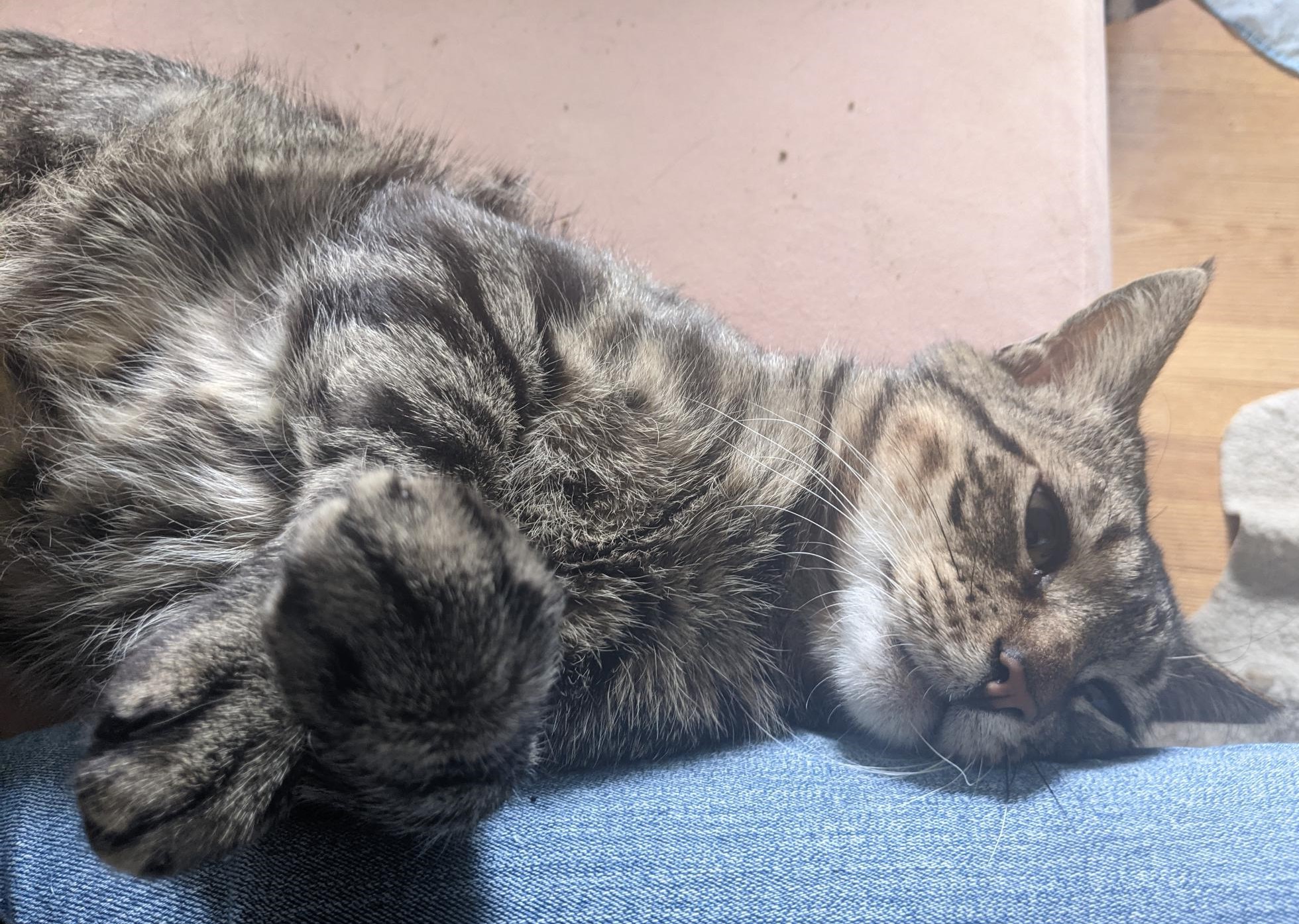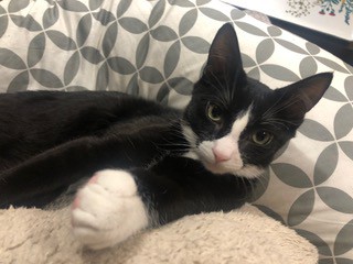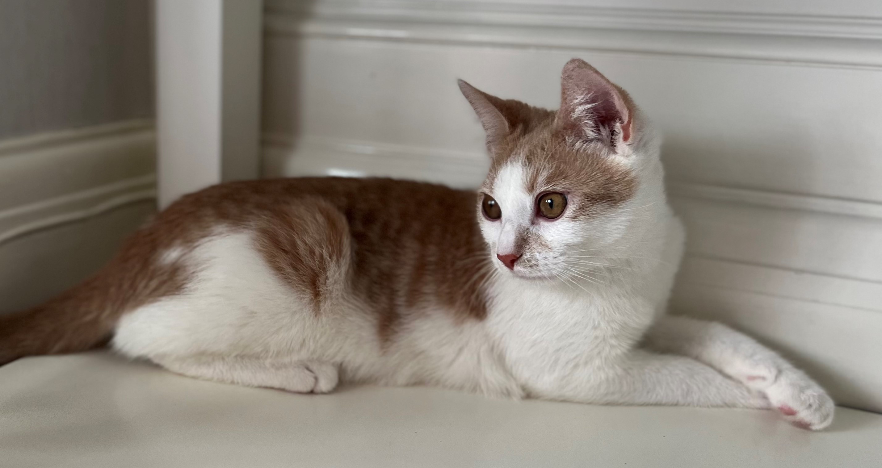 Born March 6, 2022 Bagel is a lovable bruiser whose primary passions in life are food and cuddling. He regularly requests to be picked up and carried around and is a generally easy-going and loving young cat. He plays extremely well with both of his siblings, despite being much larger than they are. He is good with new people and will generally start purring as soon as anyone gets near him. Bagel would love to continue his adventure in a new home where there is either a young adult cat or with his sister Brioche (also featured on this website).