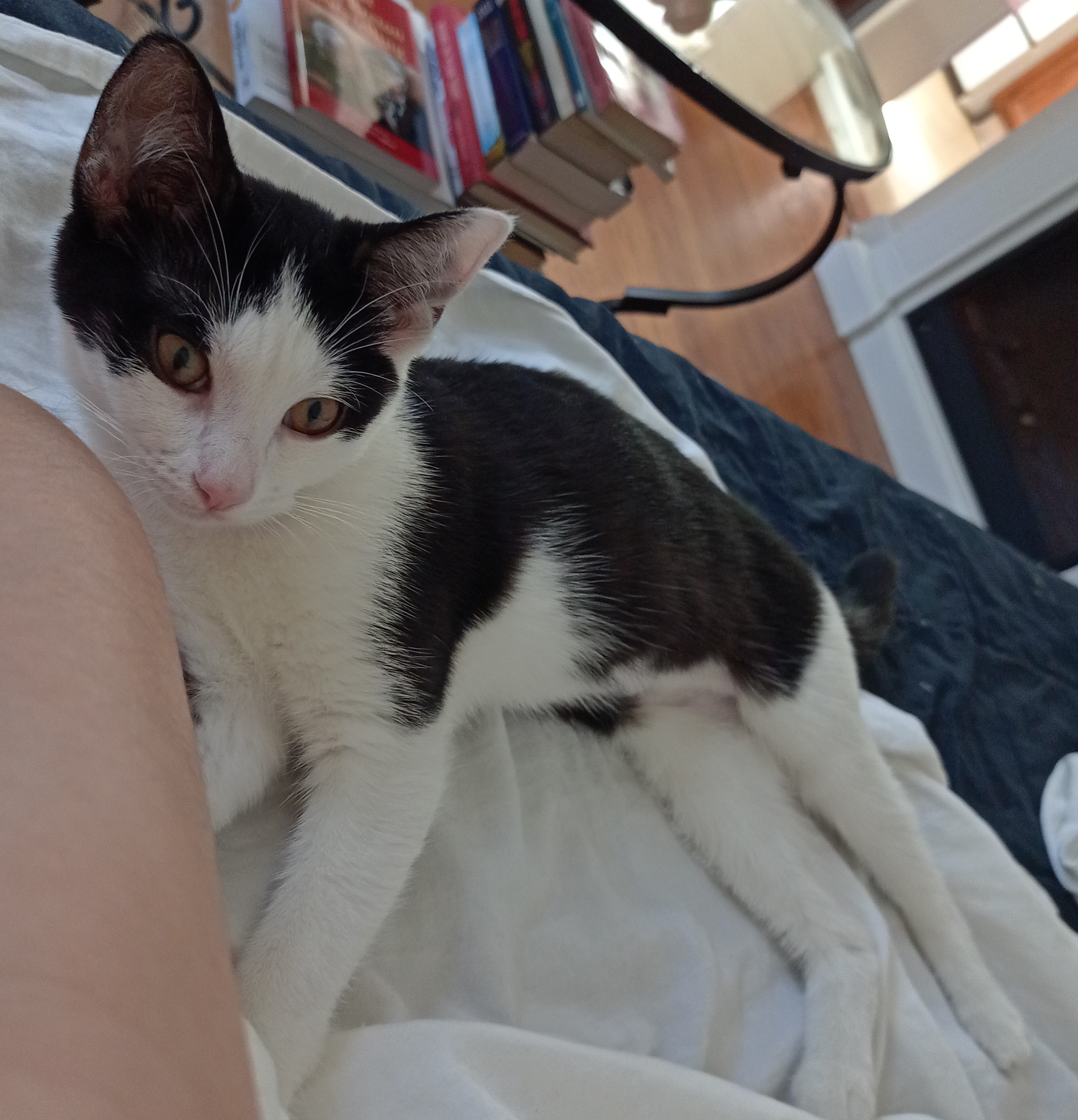 is an easy-loving girl and beautiful too. She loves playing and investigating all corners of our house. After losing her long time home she took a little time to feel comfortable but now circulates with all the other cats and is happy with us human beings too, making sure we are nearby.