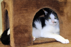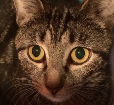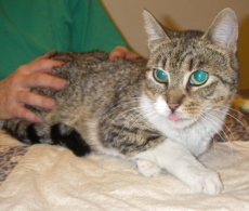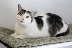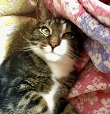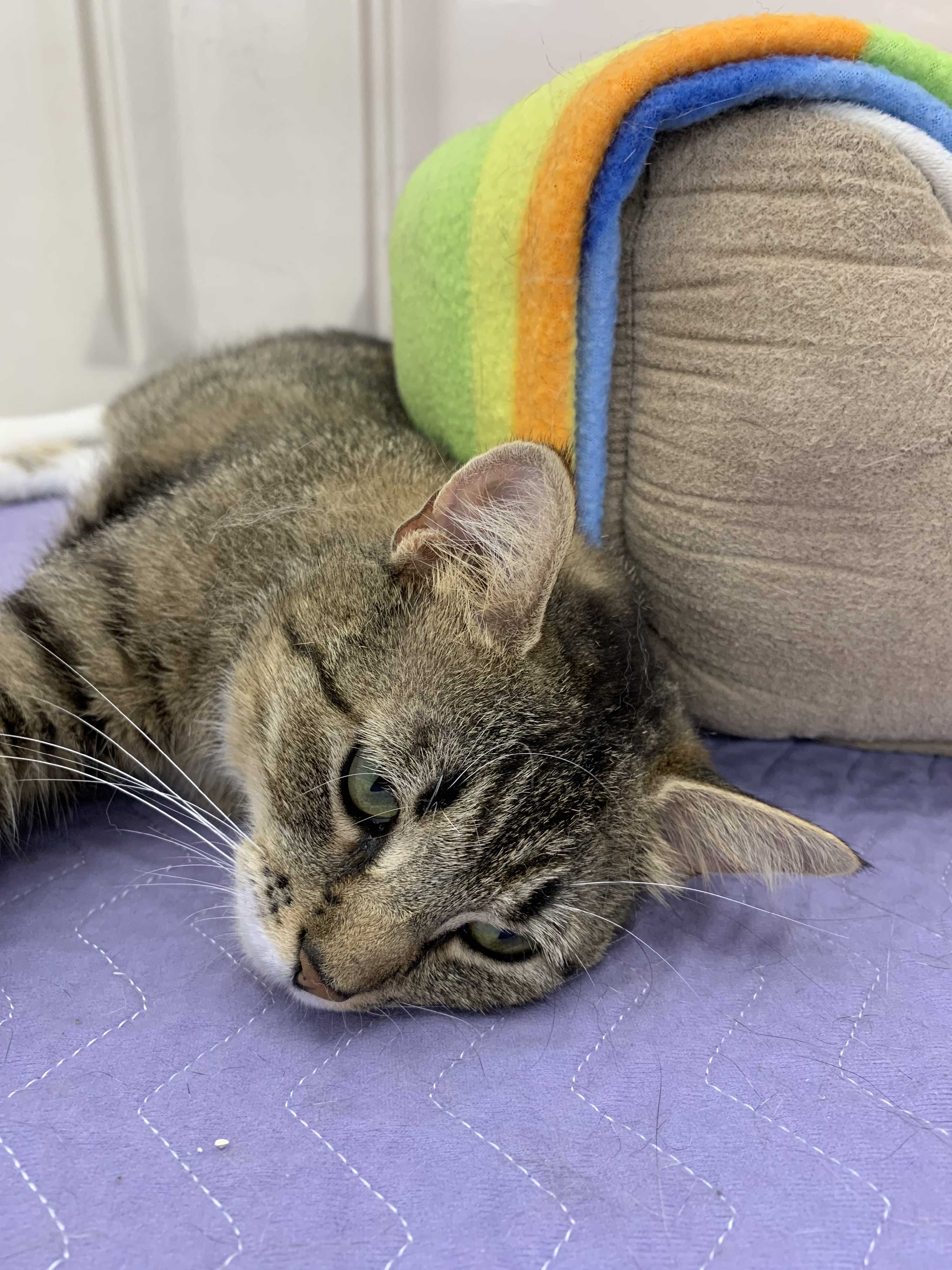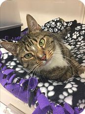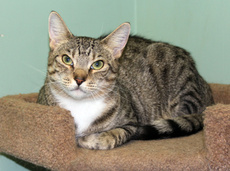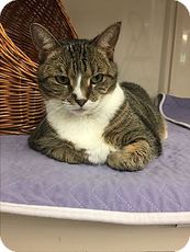 Bandit is a quiet, calm boy who just loves to have his head rubbed. This kitty does get along with other cats and loves to snuggle in his dome bed. He is a very handsome cat with striking tabby markings. kc