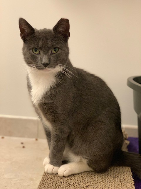 Bud, a dark gray tabby male with a white neck, chest and socks, loves to pounce and is the first to explore new rooms and toys. He melts on your lap when sleepy and observes his surroundings with calm regard.