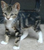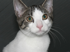 Buster is a beautiful kitten with patches of tabby stripes mixed with white blotches. He's got the most active personality in his litter of five. He loves to bounce around room and sneak up on his brothers and sisters. Buster is extremely affectionate and would love to have another cat to wrestle with.(bc)