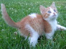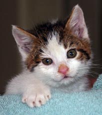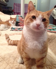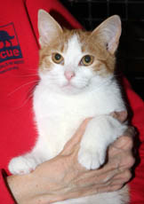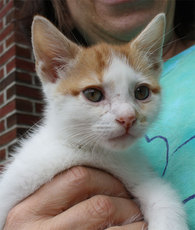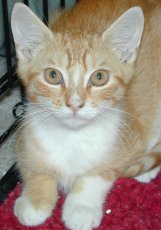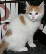 Basil is a healthy, happy boy whose sturdy size at only 8 weeks old (as of 5/29/10) suggests some Maine Coon in his background. With his distinctive orange and white coloring he is a standout guy, with an energetic personality to match. He will simply charm you with his spunk and his antics, and he enjoys being held and cuddled.