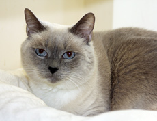 Burgundy is a 9 year old Siamese/Maine Coon mix female She was adopted from a shelter as a kitten and returned 9 years later with her brother when owners decided to move. She was doing poorly in a cage and is now in a foster home where she is adjusting. She is used to being in a home with a family and gets along well with other cats.