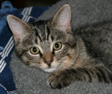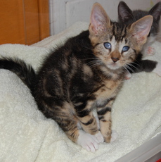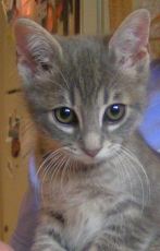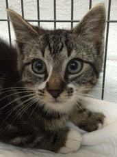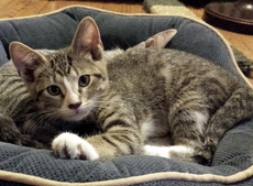 Buzz is full of energy, a friendly tabby, about 10 weeks old with a cute tail that curls up. He keeps busy playing with toys, loves snuggling when he takes a break. Buzz and his brother, Bugs, reside in a foster home. Adopt the pair for loads of fun, it's such a joy to see them play with one another!