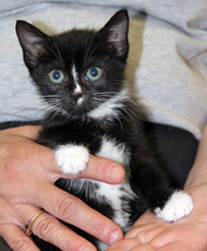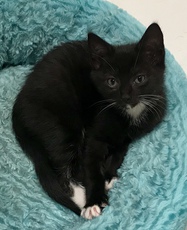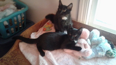 Buffy & Buddy are two darling male black kittens with white tufts under their chin, about 10 weeks old (as of 8/11/17) raised almost from birth by their foster mom. These two are everything you look for in a kitten: lively, spunky, sweet and gentle. They are simply delightful! Very loving, very playful and very affectionate. They follow their foster mom around the house and are quite social. They enjoy being picked up, cuddling and purr constantly. Buffy & Buddy are quite bonded and we prefer that they be adopted together.