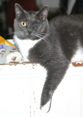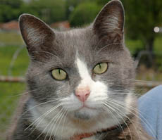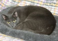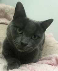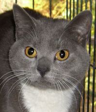 BUBBLES, declawed, is a people cat and very eager to snuggle on your lap, sit on your desk, help you with your computer, and watch television with you. A big Russian blue with a sparkling white bib, he is altogether handsome. You would hardly notice one closed eye. He will live peaceably