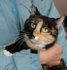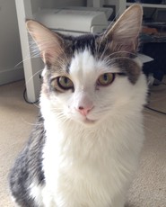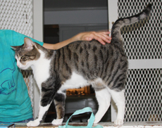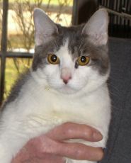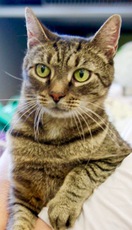 is a tabby and white female with bright gold eyes, about 9 months old. She gets alone well with other cats and is very sweet. Loves to be petted.