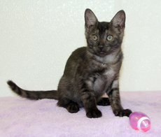 Basheba is a tiny 1 year old female (4/22/15) kitty who is the size of a 5 month old kitten and will stay that way. Basheba was left in a shelter where she was petrified. She is now flourishing in her foster home. This little lovebug wants to cuddle in your arms and be petted on your lap. She is very quiet and gentle and good with other cats.