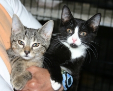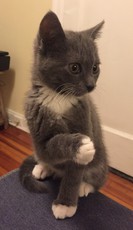 Blossom, a gray tabby with a white belly and legs, loves to climb and tilts her head coyly to win you over. Both come running when a person walks into the room. Because they were the only litter mates, they have a built in bond. These young kittens must be adopted together or into a household with another kitten or young cat.