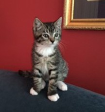 Bear is a dapper little fellow in his chocolate pin-striped suite and spats (at least that's how his white hind feet appear!). He is a kitten of many talents. Bear likes to imitate dogs by following his humans around the house. He's the perfect host who greets all visitors and socializes by climbing into any welcoming arms. His "thank you" is a rumbling purr. Bear is a teacher, too: he trained two fellow foster kittens how to be outgoing, just like him. This love bug is great with other cats and despite a health crisis when he was small, he is happy-go-lucky. With daily meds, Bear is robust and playful. Give this snuggly fellow the reward of a loving home, one that can honor his upbeat personality and resilience!