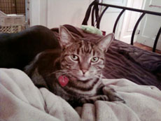 Bandit, Benny’s roommate, is about 8 months old and as good as can be. He was a little reticent with Benny at first which tells us that if you’re looking for a companion for a cat that might be intimidated by a particularly assertive one, he would be perfect. Bandit is very happy to be cuddled and to cuddle back. He has no hang-ups. As you can see, he is beautiful with his soft coat and amber eyes.