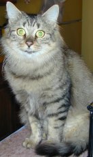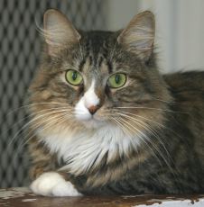 Barrett is a "saved" kitten that his current fosterers trapped, had neutered and vaccinated. Barrett has the look, structure and size of both a Norwegian Forest Cat and a Siberian Forest Cat. At approximately one year old, he weighs 12.5 pounds and is still growing. This handsome male is full of energy, intelligent, seeks human companionship and loves to play (great with adults but not with kids) and gets along well with the five other cats in his fosterer's household (though he occasionally gives chase and is somewhat dominant with an "alpha" cat personality). To meet Barrett, contact Brian at Byrons@erols.com or 631-261-3486.