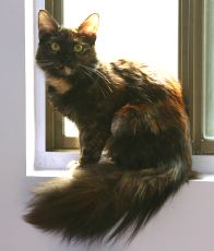 is a gorgeous long-hair Tortoiseshell with a fluffy tail, about 8 months old. She is very sweet and friendly. She is in a foster home with dogs and other cats.