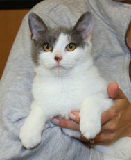Bam Bam is a handsome male kitty (brother to Pebbles), about 4 months old now and ready for his forever home. He is white with very handsome grey tabby markings, and has a personality to match his good looks. Like his sister, he is easy to pick up and enjoys a good cuddle. He is close to his sister and would love to be adopted with her. Bam Bam is neutered, in excellent health and up to date with all vaccinations.