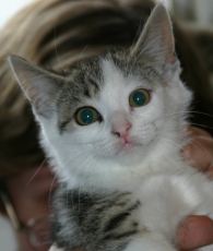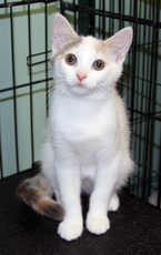 This Bubba is a sweet female white and black kitten, about 4 months old now (born May 2011). She is the sister of Anna, also featured on our website and was found on the streets and rescued. Now in a foster home, she is very friendly and playful. Also, she gets along well with other cats, dogs and children.