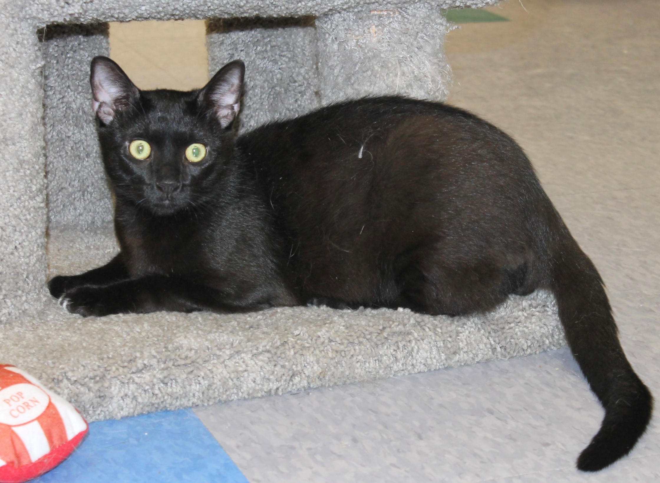 is a pretty 1 year old girl was found wandering the streets. We took her in and had her spayed. She has beautiful green eyes, is very affectionate and loves to play with her toys. She gets along well with other cats too.
