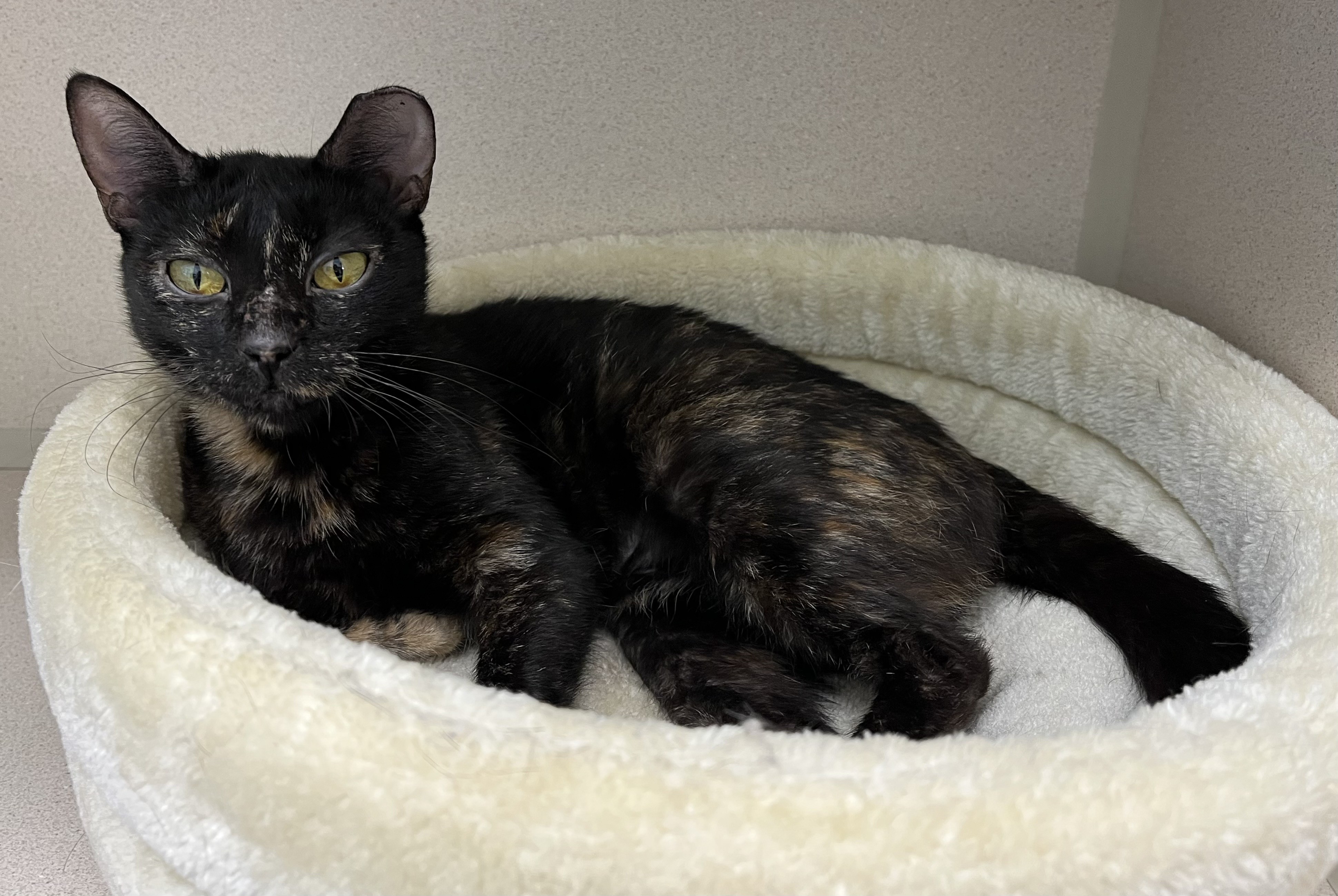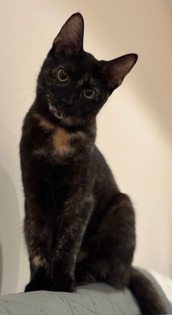 DOB: 4/18/25 Meet Dusky: The Peekaboo Tortie with a Heart of Gold This little tortie is a shy soul with a playful streak waiting to shine. She may hang back at first, but win her trust and you’ll find a sweet, gentle friend who adores batting her toy ball around like a tiny soccer star! Once she knows you’re hers, she’ll even come trotting over when you call her name! With patience and love, she’ll turn your home into her happy playground — and your lap into her favorite spot.