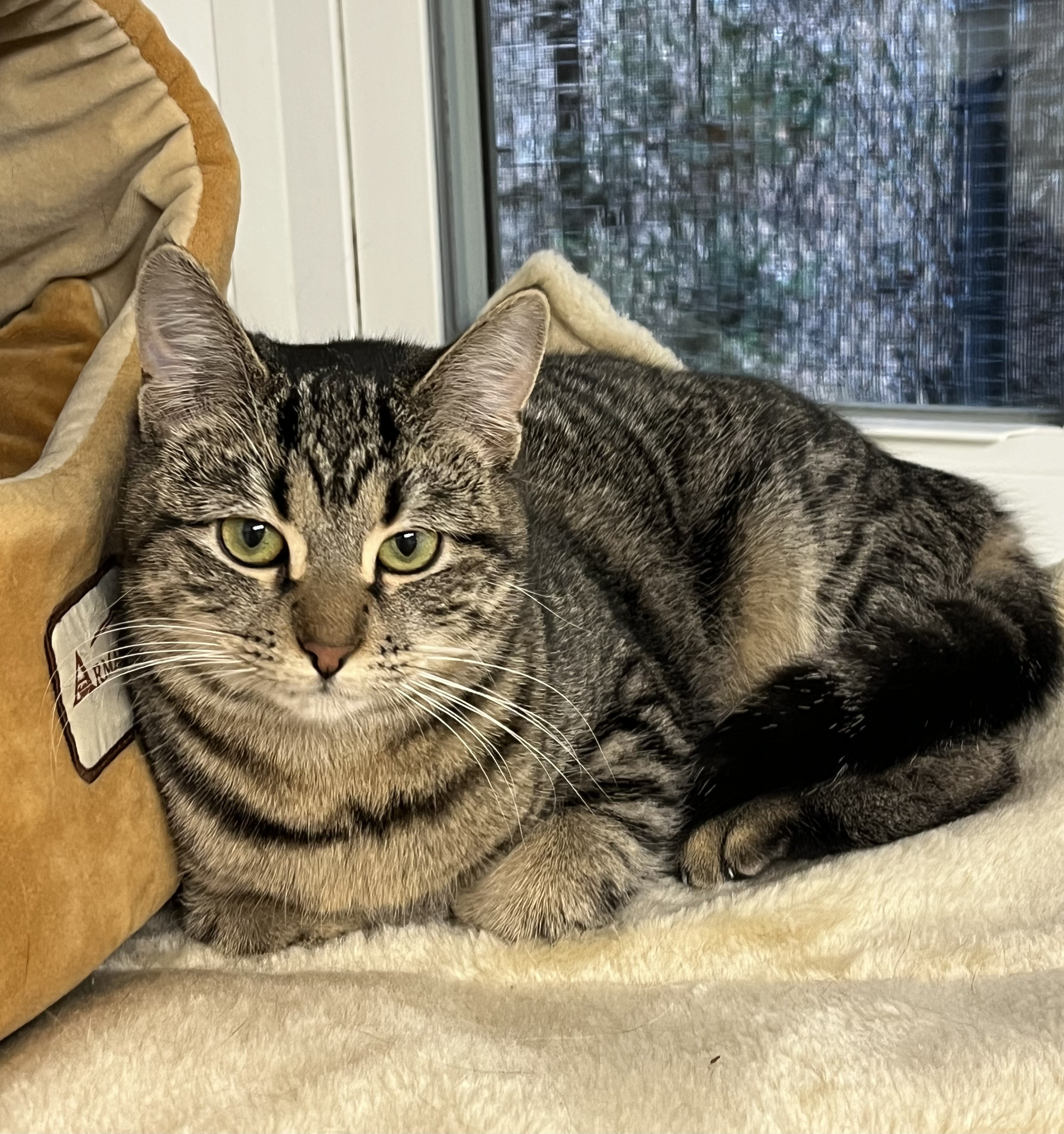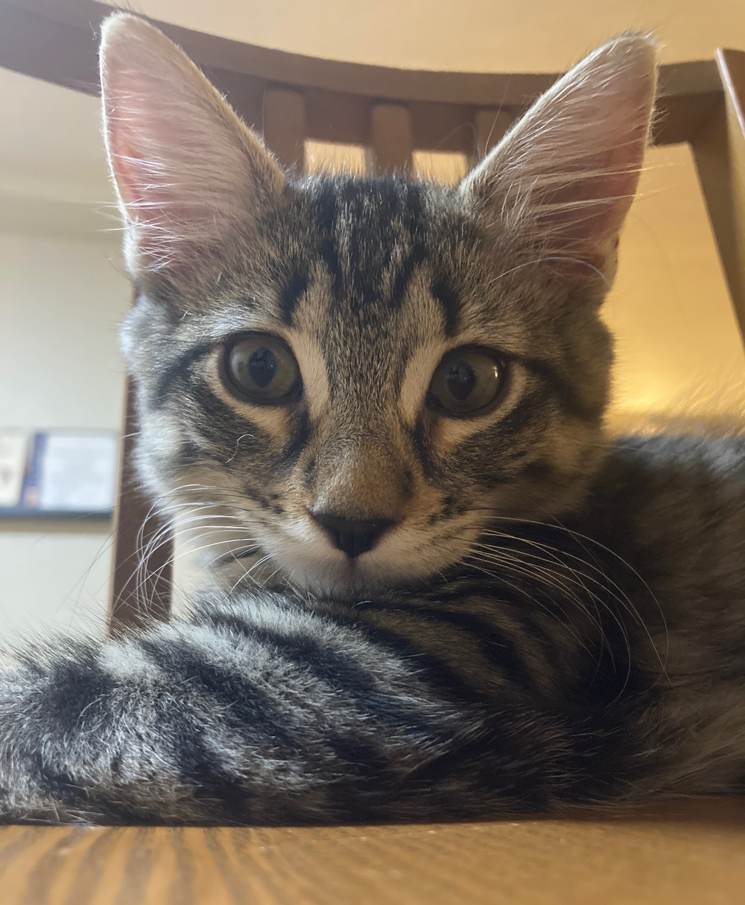 Born August 2020 Dante is a tabby boy with an engaging personality. He has slightly crossed eyes which simply adds to his charm. Dante is fun and affectionate. He loves to play and doesn't mind keeping himself busy while you work. Just keep a supply of small cat balls on hand, they're his favorite. Dante is comfortable with children and would be a wonderful companion for another young cat.