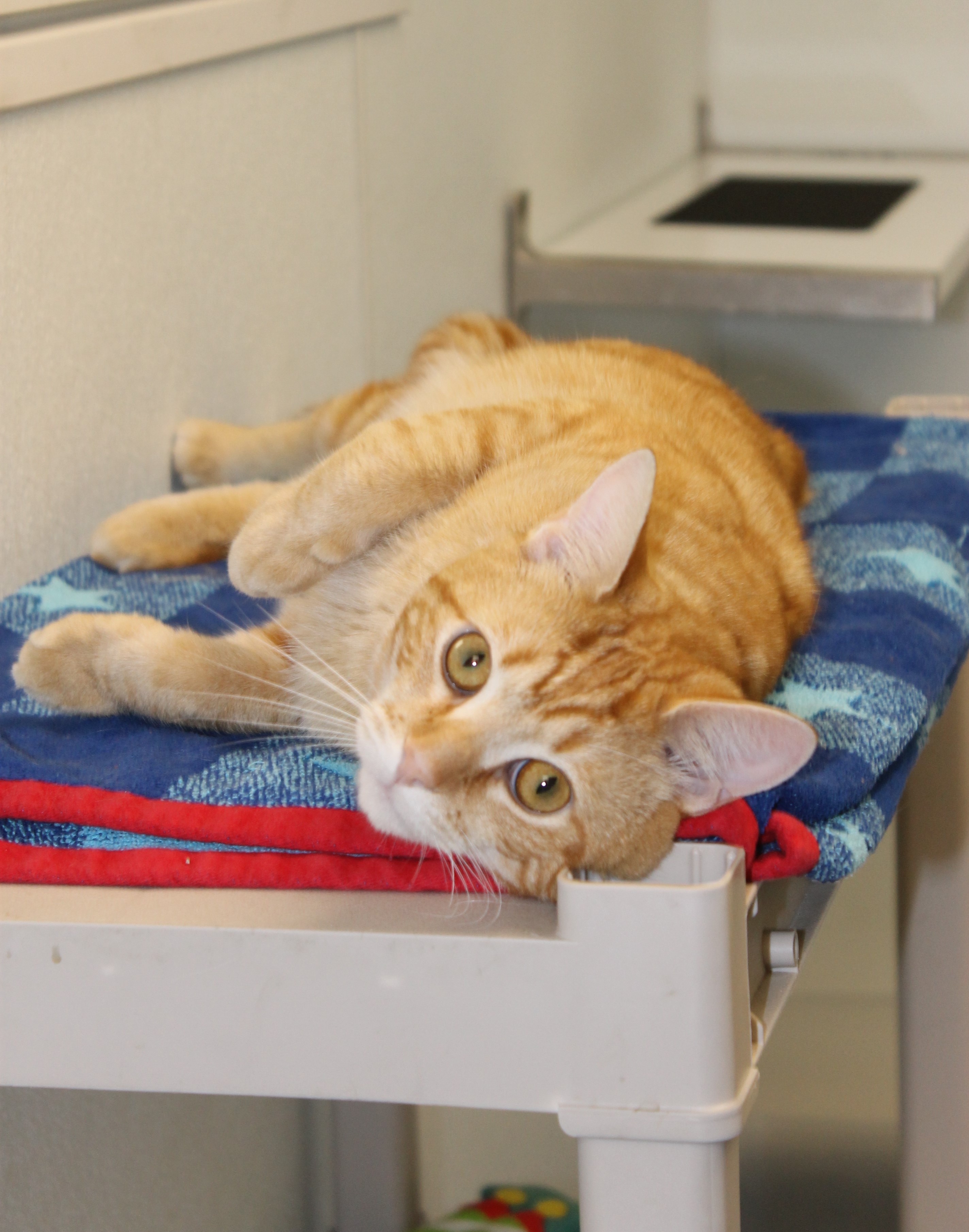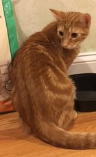 Duffy is a gallon of fun in a pint-sized body! This lovable blond (he's not exactly orange) rascal purrs in delight when spoken to and will "dive bomb" under your hand to ensure he gets petted. Duffy enjoys a soft lap yet sometimes doesn't stay long as he is a bundle of energy that investigates everything. Play time with his humans and/or with other cats is the highlight of his day. He loves cat companions and is getting used to dogs. Duffy was born around late April 2014 and spent the first few weeks of his life in a store parking lot. He's now very ready to have his forever home!