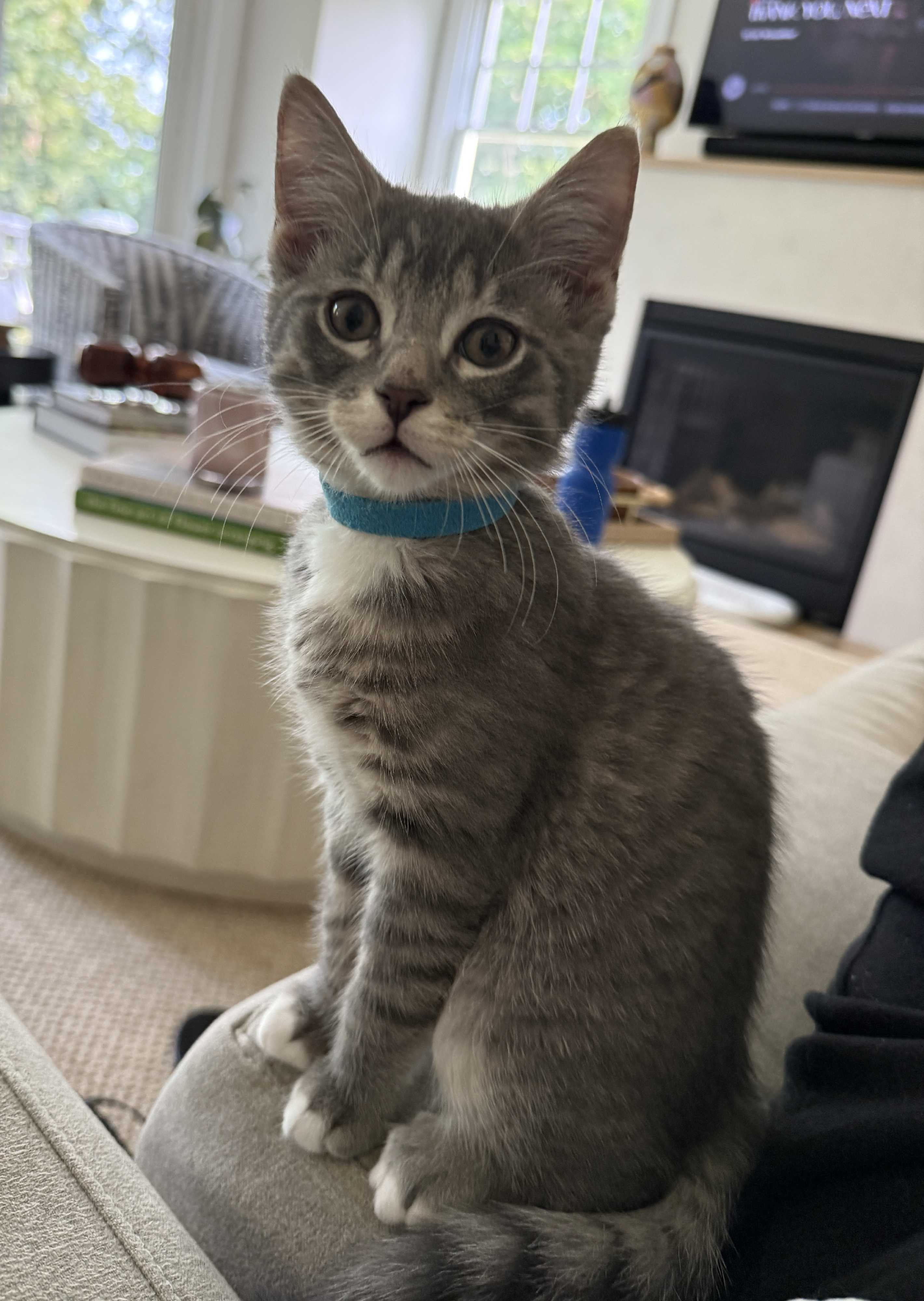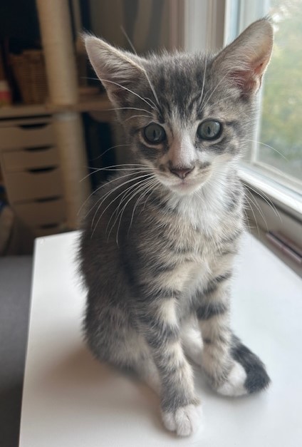 Meet Dusty – The Sweetest Little Explorer - DOB: 3/12/25 Dusty is a curious, cuddly, and undeniably adorable kitten looking for his forever home! With his soft grey fur, bright eyes, and playful personality, Dusty brings joy and energy to every room he pounces into. He loves to play, snuggle, and zoom around on his adorable little paws — and the best part? He gets along wonderfully with dogs, including his foster family’s gentle white golden retriever! Whether he’s chasing toys or curling up for a nap, Dusty is full of love and ready to be your loyal little companion. If you’re looking for a kitten with a big heart and an even bigger purr, Dusty is your guy. Come meet him and fall in love!