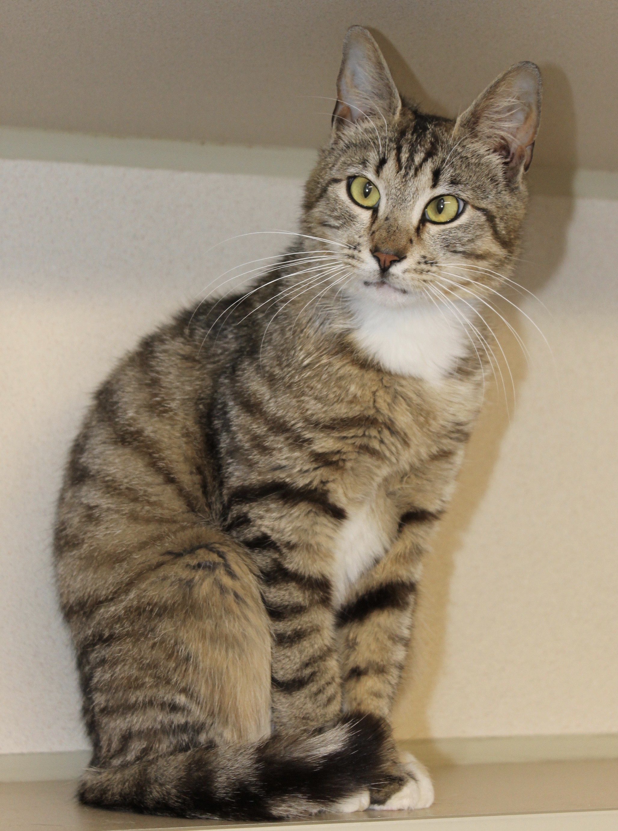 Are you ready for your new best friend? Six months old, Demi is a sweet, confident and very friendly kitten. She is happy to say hello, comes when approached, and is coyly curious about what is happening. When being held Demi situates herself comfortably with her paws on your shoulder and seems to say "ok I'm ready to go explore with you!" She has a beautiful tabby pattern with polka dots on her flank - very unique. If you're looking for a perfect 4-legged little sidekick and friend, you'll be a great fit for Demi!