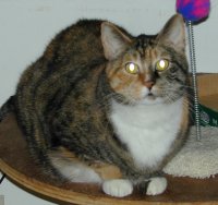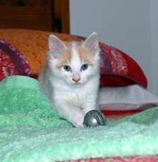 Dancer (approx. 2 1/2 months old) is as active as her name implies. She is always on the go and absolutely loves to play. She loves her brother Blitzen, likes other cats as well, and is getting used to dogs, so that she can have even more playmates. She is a cutie!! (jr)