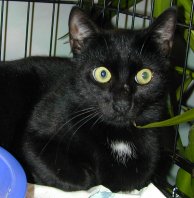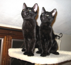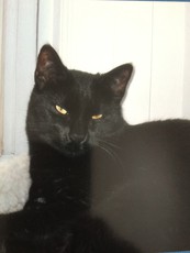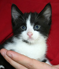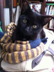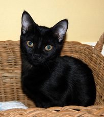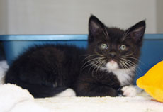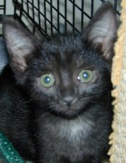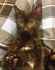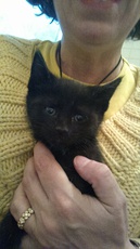 Donny looks like a little panther with his fuzzy ebony coat. This handsome kitten is about 10 weeks old (born mid July 2011). He has gained confidence and now settles on a warm lap. His brother (Danny) is his best friend and they play, nap, snack, explore - do almost everything together. Donny is a little love who would thrive with affection in a quieter home.