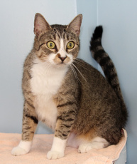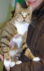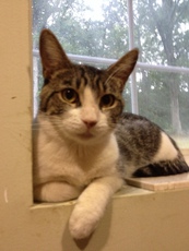 Daisy is a very gentle girl that loves to have her belly rubbed. If you're looking for a lap cat and a kitty that loves to be held, Daisy is your girl. She is about 1-2 years old and was abandoned when her owner moved. She is a lovely brown and white tabby with delightful green eyes that seem to just sparkle with delight when she is petted by a kind human.
