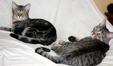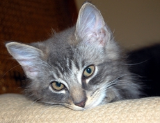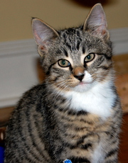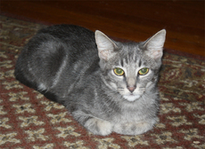 Danny is incredibly handsome with his medium-length coat of silver stripes. He likes to have his ears scratched and purrs his delight. Danny likes to hang out on top of a rolltop desk and supervise any computer work. He is especially fond of toy mice and snoozing with his brother (Donny). Danny is about 10 weeks old now (born mid-July, 2011).