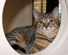 As handsome as he is goofy, this young grey tabby will win your heart with his playfulness, affectionate nature, and sunny disposition. Duke lives up to his name with an almost regal air, and then surprises visitors with his kitten-like silliness. This big guy is fine with other cats and will surely brighten the life of the lucky person who chooses to take him home. Duke is declawed.